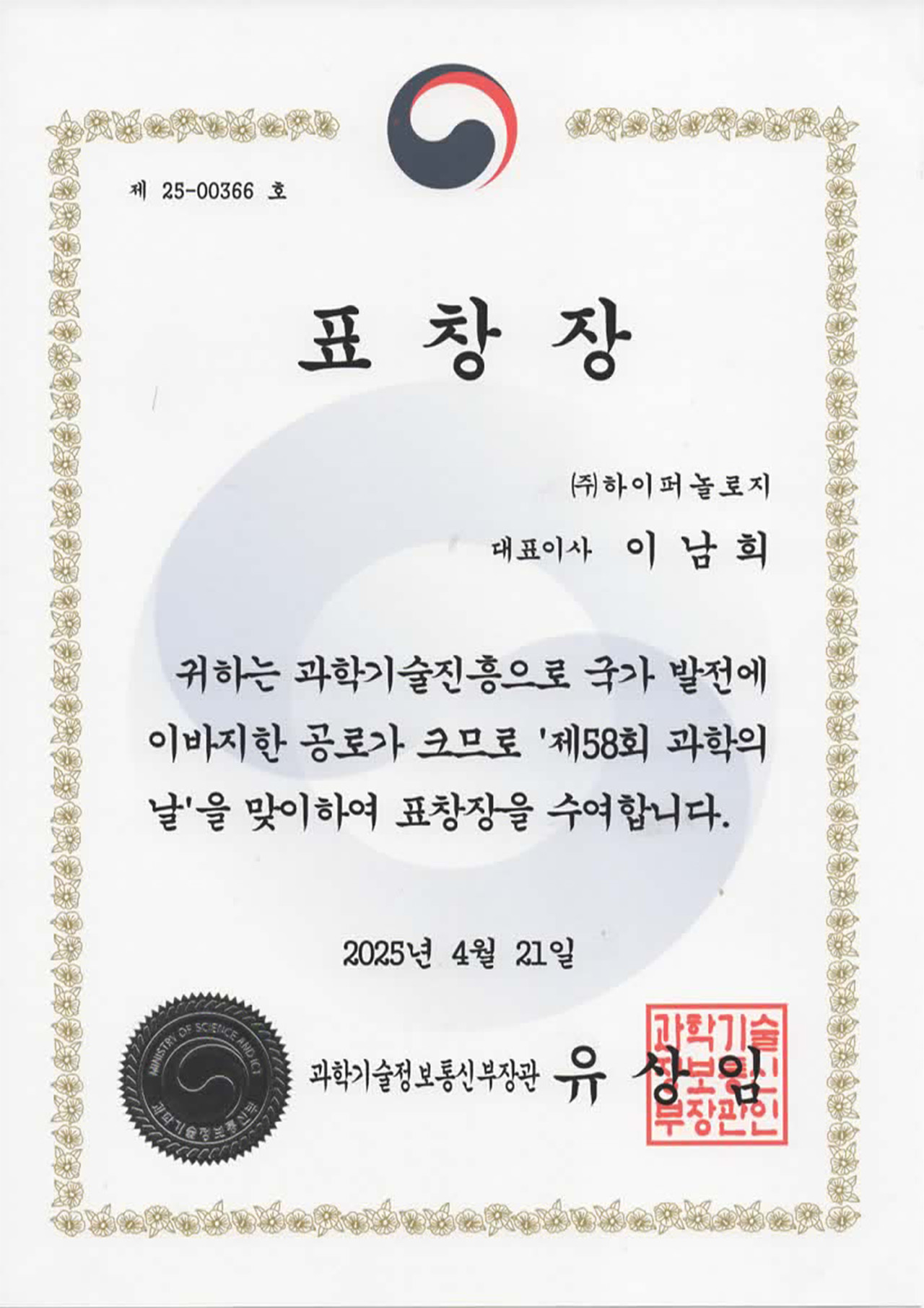 과학기술정보통신부장관 표창 수상