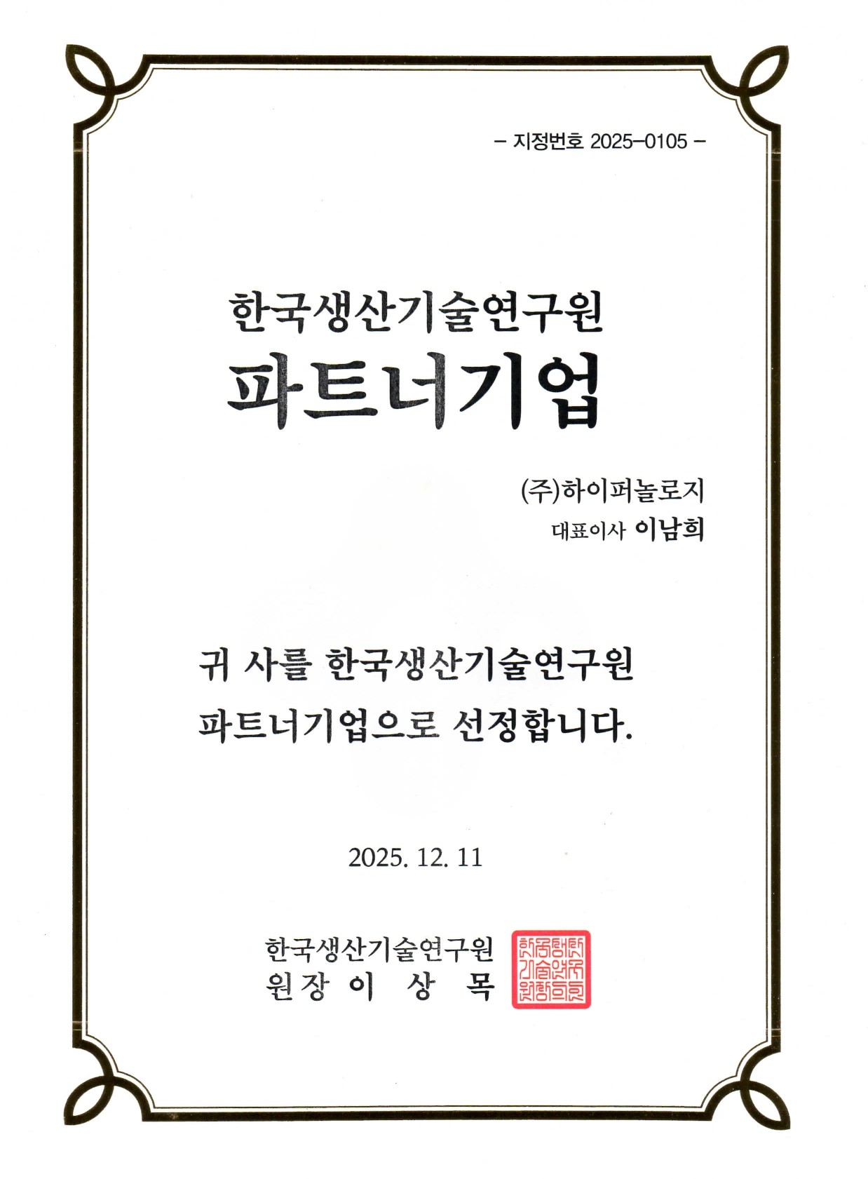 한국생산기술연구원 파트너기업 선정